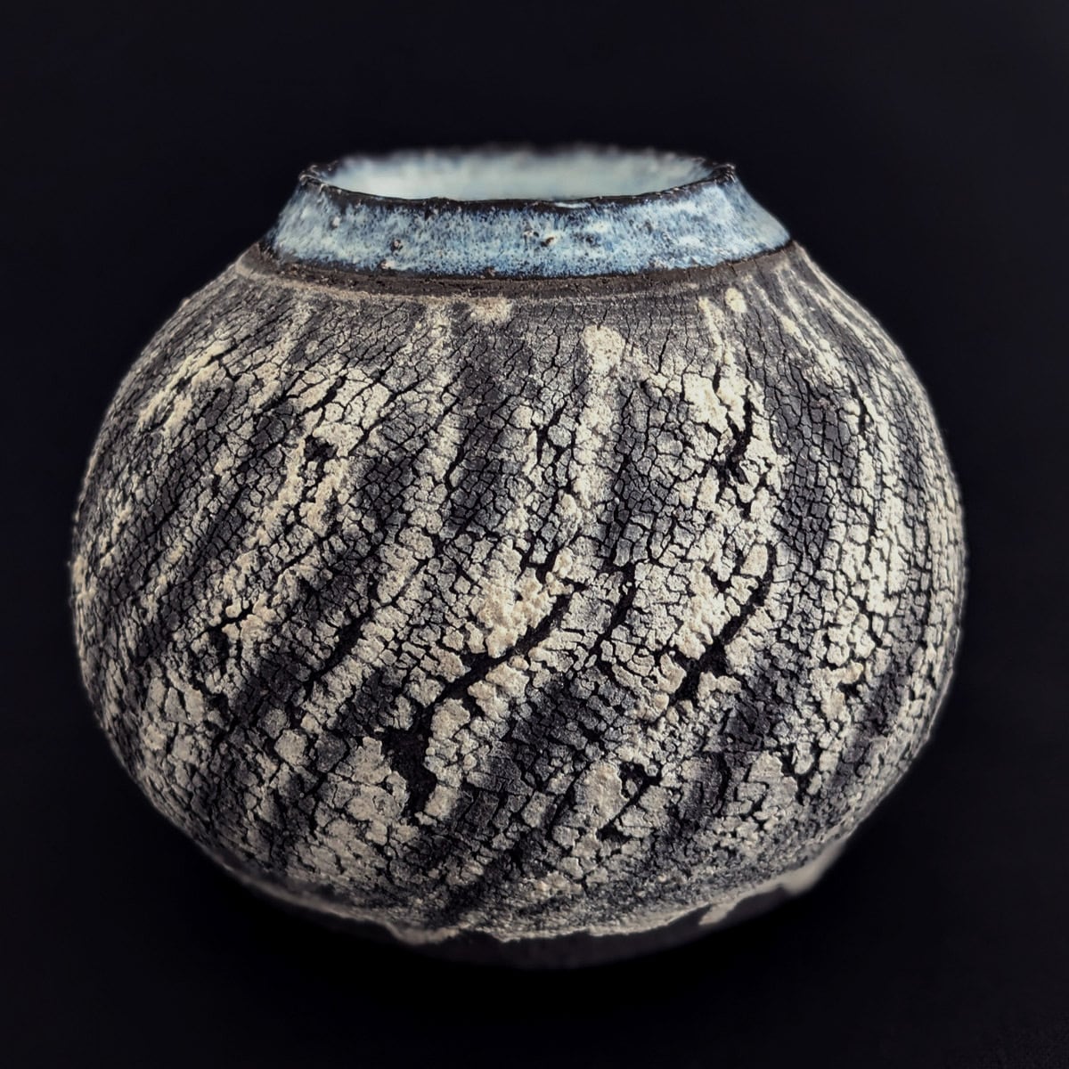 波打つ白い象裂を纏った美しい壺型の一輪挿しです