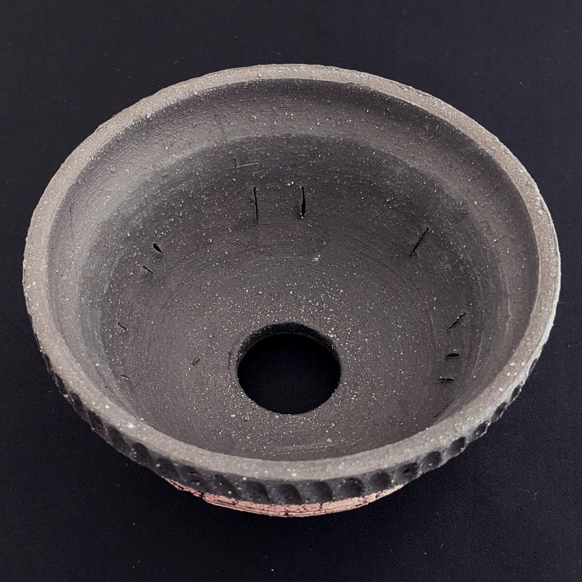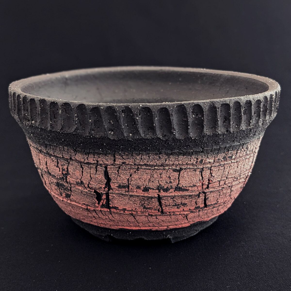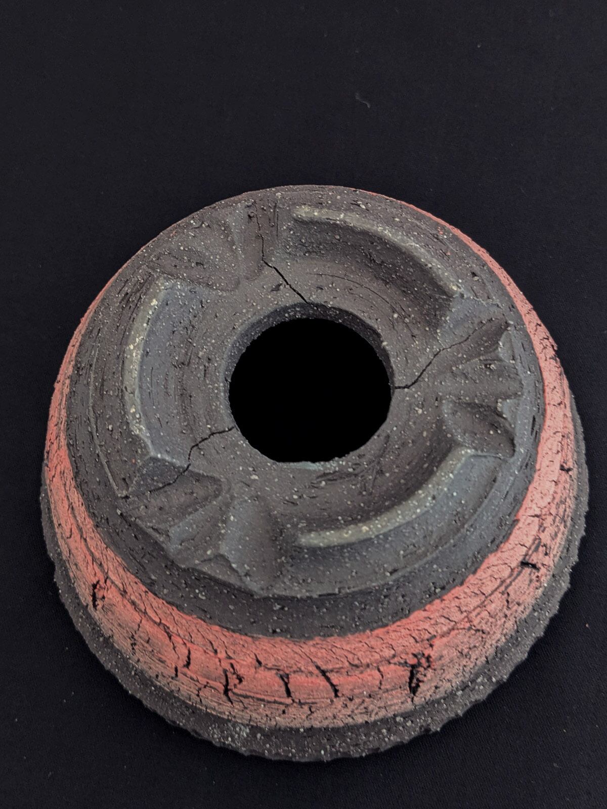 黒焼き締めのボディの胴部分に赤い象裂の入った灼焼き締め