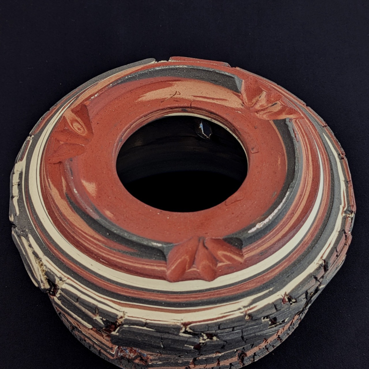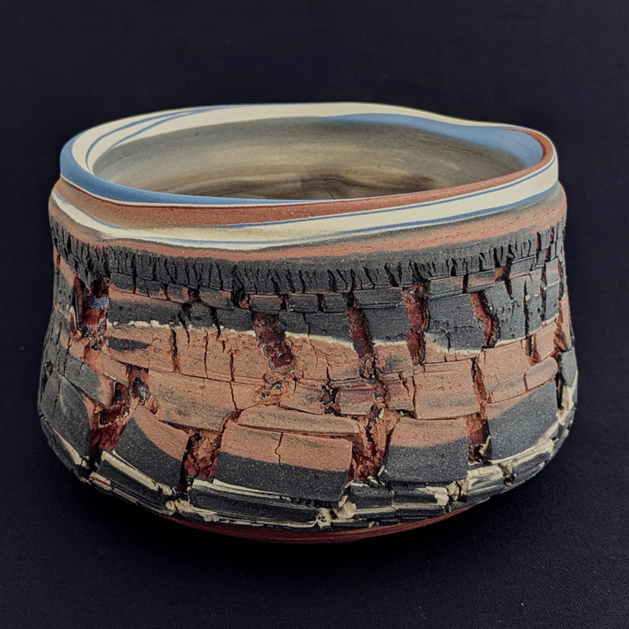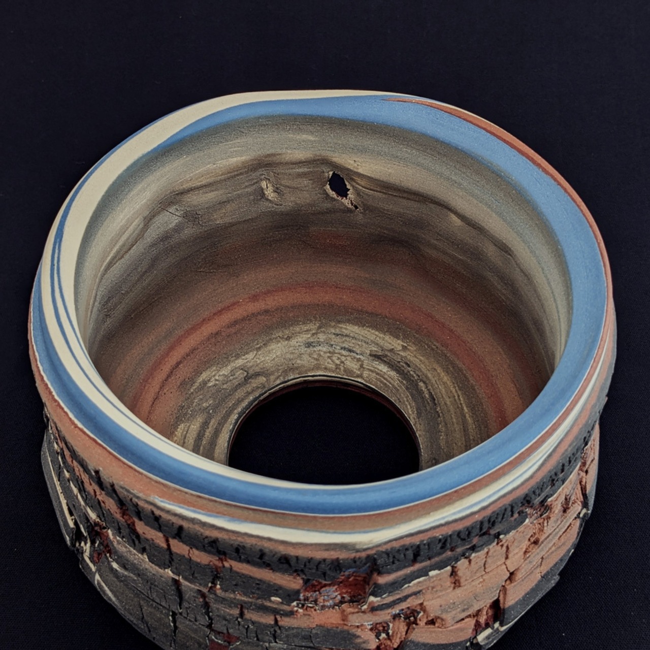 色の違う練り込んで地層のような模様を練上げた素地に
