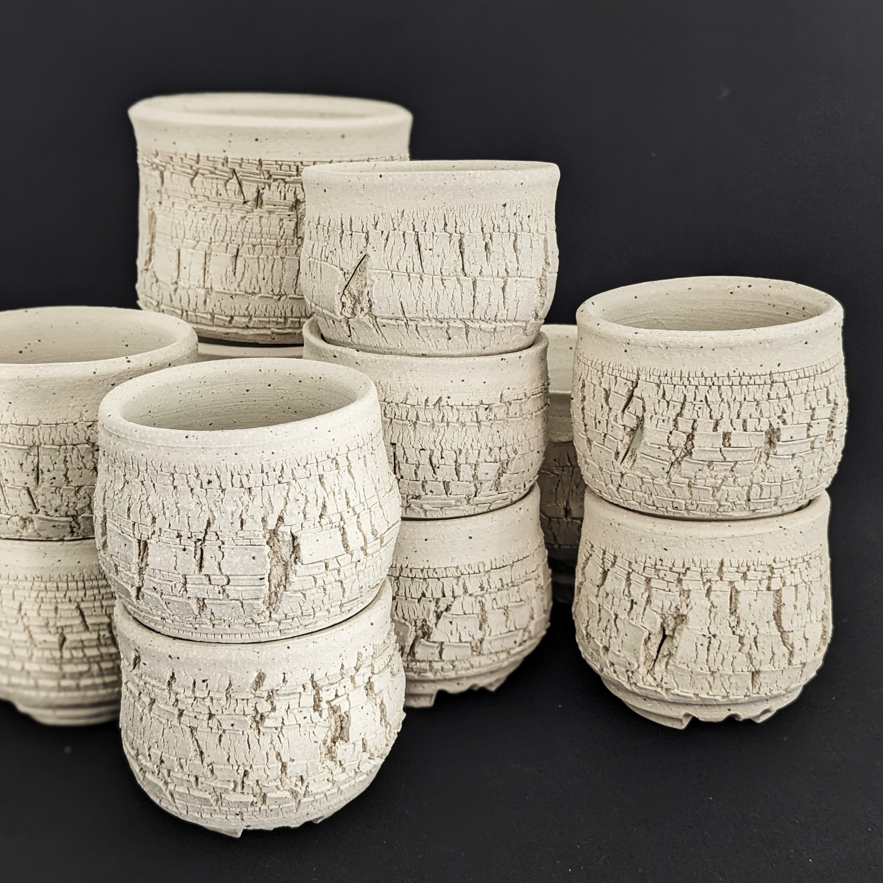 バキバキの象裂でご好評をいただいておりますICHIHOPOT壱の白土を用いた焼き締めバージョンです。なにか尊い、神聖な雰囲気が漂う鉢です。